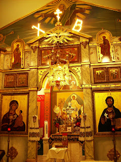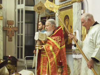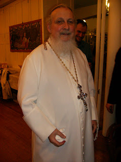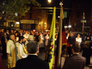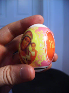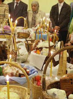 Top row: The St Anne banner and the tomb with the burial shroud. Second row: Mother Anna the resident nun reads from the Acts of the Apostles. After the midnight street procession round the block: in the foreground are the tsar’s old flag and an old Russian tricolour, again the national flag. World War II refugee Russians started the church in 1951. Third row: During the hours (offices) before Liturgy: Fr A in the altar and Fr Valery the deacon putting the thurible in motion. Fourth row: Fr A at the Great Entrance. As you can see the liturgical colour has changed. Blessing the baskets afterwards. Fifth row: Shrinking plastic wrap for eggs. Somebody gave me this one. Seems too pretty to use and has anybody else got a problem with using icons for something that will be thrown away? BTW that’s Our Lady of Kazan. Bottom: One of many ways great and small that real life is better than online: in this immigrant parish there’s no petty anti-Western rubbish as they have nothing to prove. Fr A in one of his Latin cassocks. White is traditional on a festal day in this tradition. The sanctuary aglow.